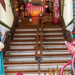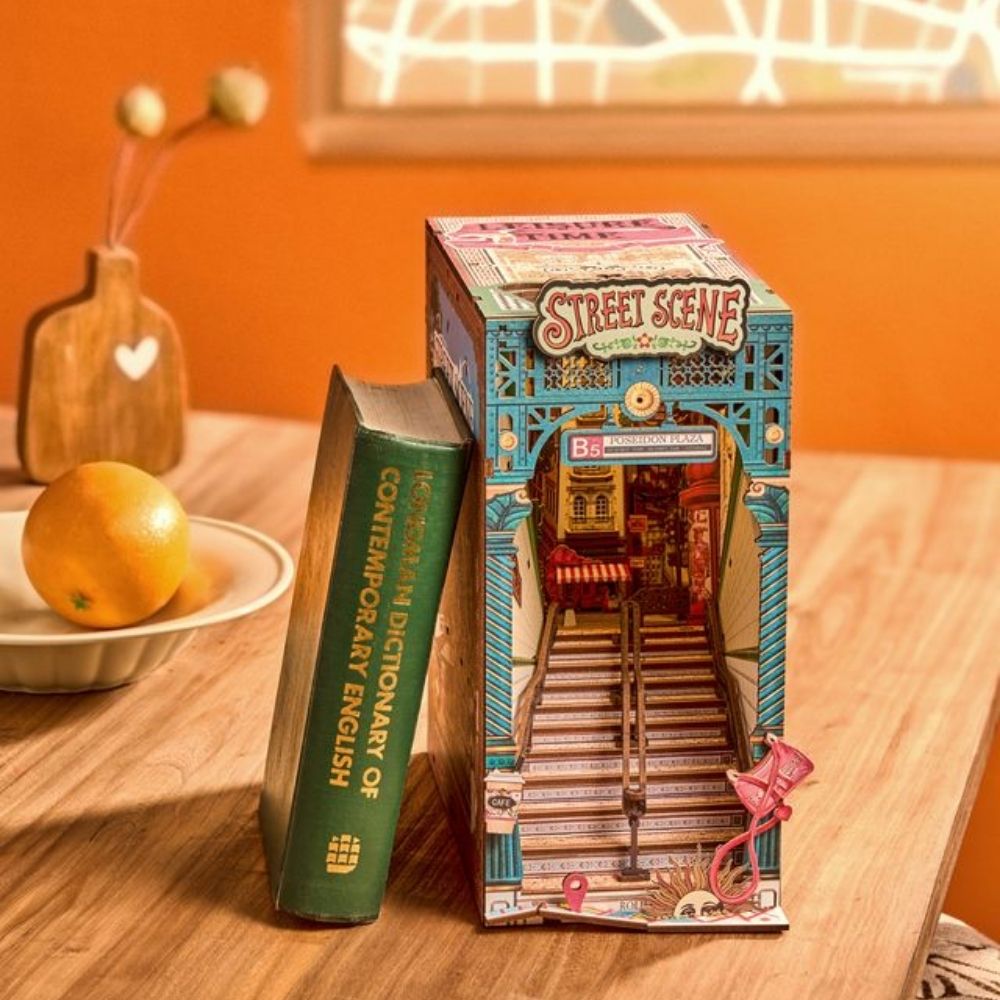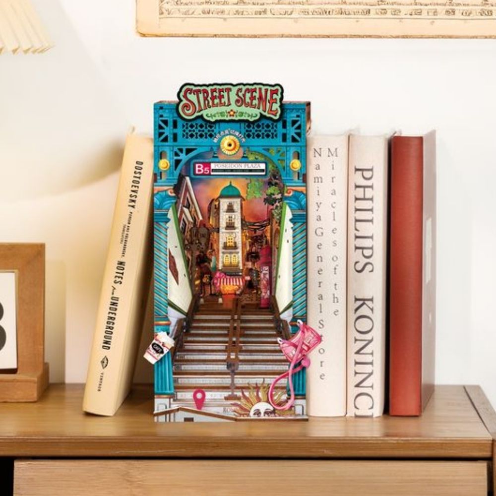 Bring the energy of city life to your bookshelf with the Street Scene Book Nook, a miniature urban transit hub full of charming details. Narrow stairs lead the eye upward, revealing street lamps, signage, and softly lit buildings that capture the city's buzz. Everyday items like a paper coffee cup and a pink crossbody bag hint at a commuter's routine, while playful touches, a stylized sun face and a map pin, invite exploration and adventure. Hidden beneath the stairs, a tiny train station surprises visitors, and LED lighting lets you switch between glowing sunset and nighttime cityscapes, creating a vibrant, immersive display.