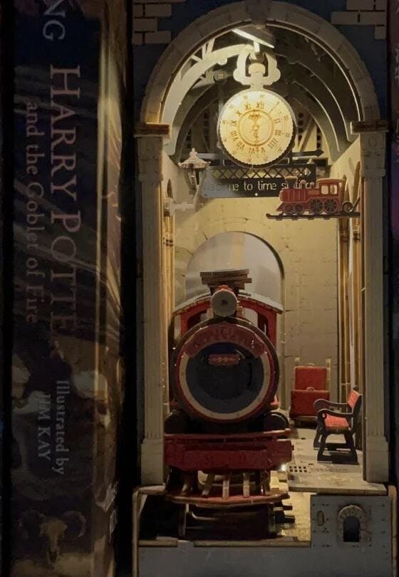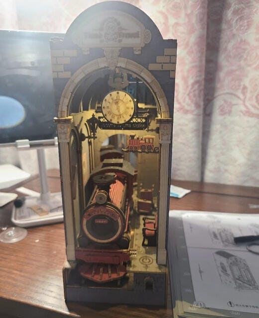 Get ready for a time travel adventure with this Book Nook for your shelf. This DIY shelf decoration project is a station that can take you to another time and space. We have provided you with all the necessary pieces and tools to create this cool miniature station scene. Enjoy assembling all the parts, and you'll have a unique shelf insert and home decoration! Hurry, the train is about to leave!