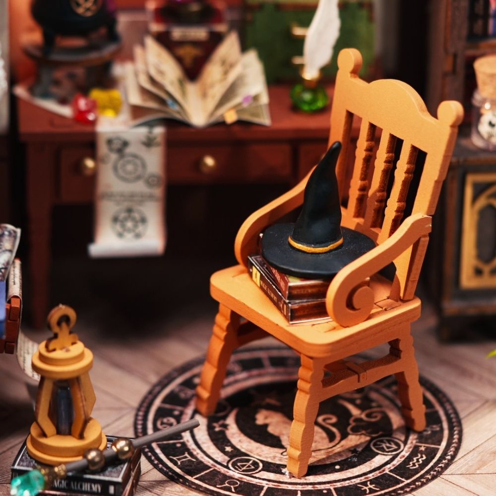 Transform your space with this miniature house kit that recreates a magical study room. This model allows you to design a space where wizards and witches prepare their potions and review their spells. The interior is richly detailed, featuring a comfortable wooden chair, shelves filled with ancient books, mysterious vials, and LED lighting that adds a warm touch to the ambiance.