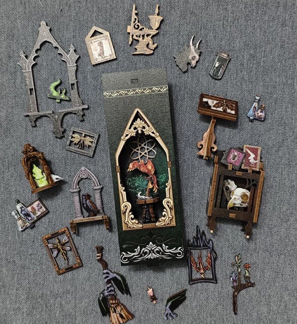 A Book Nook is a miniature diorama designed to fit between books on a bookshelf, but it can also be displayed on any flat surface. These charming DIY kits allow you to create a small, detailed scene that adds a touch of magic and whimsy to your book collection or any room in your home. Each Book Nook tells a unique story, transforming your space into a window to another world. Perfect for book lovers, DIY enthusiasts, and anyone who enjoys creative projects, Book Nooks are a delightful way to showcase your creativity and bring a bit of fantasy into your surroundings.