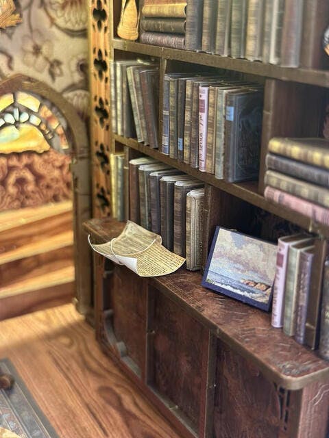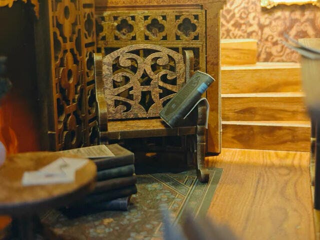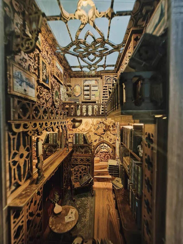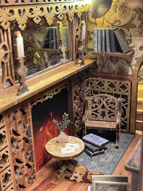 The classical design of this Book Nook features an upper and lower floor, with a corner staircase that creates an upward flow, enhancing the sense of space. The open design allows light to illuminate the intricate details inside. Imagine yourself by a cozy fireplace, surrounded by shelves of antique books and accompanied by a loyal dog. The scene is beautifully complemented by ornate wall lamps, framed oil paintings, and vintage candles, creating a warm and inviting atmosphere.