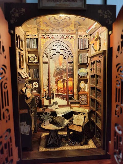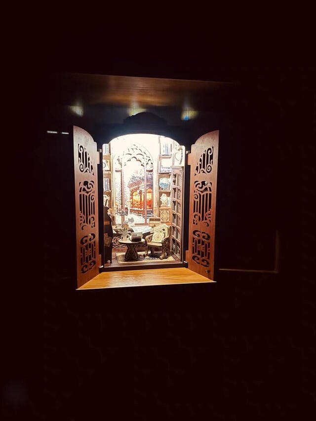 Once complete, carefully slide your Book Nook onto your shelf between your books. The built-in lighting creates an illuminated, captivating window into your miniature world.