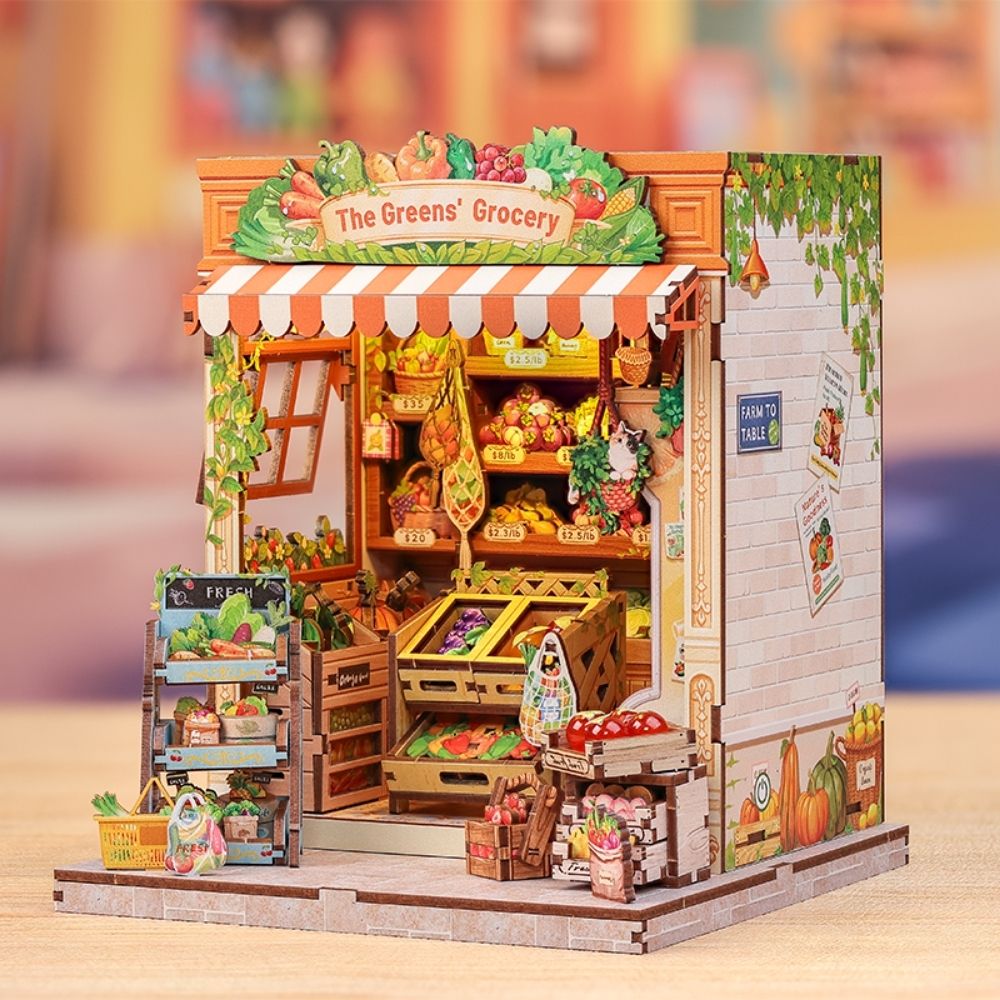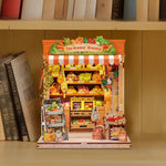Fruits Frais est un marché miniature où la lumière du matin met en valeur les couleurs éclatantes des fruits et légumes. La façade en briques et le store rayé créent une atmosphère chaleureuse et authentique. Ce kit vous permet de construire une maison miniature qui reproduit cette scène quotidienne pleine de vie sous forme de diorama, apportant charme et simplicité à votre intérieur.