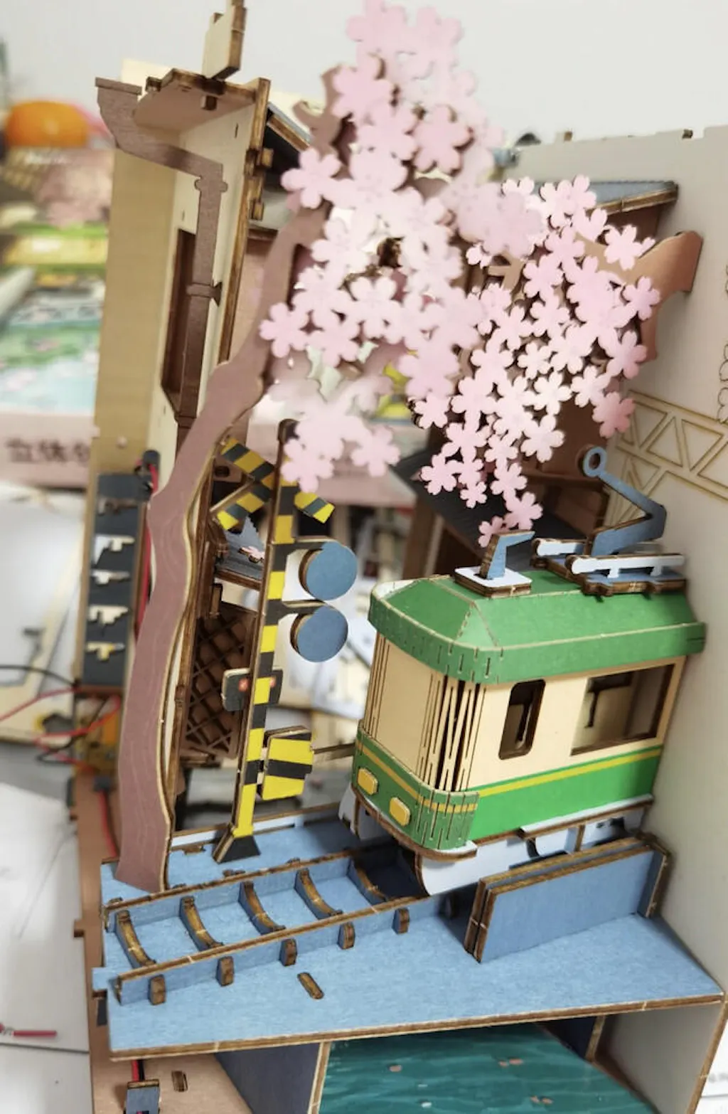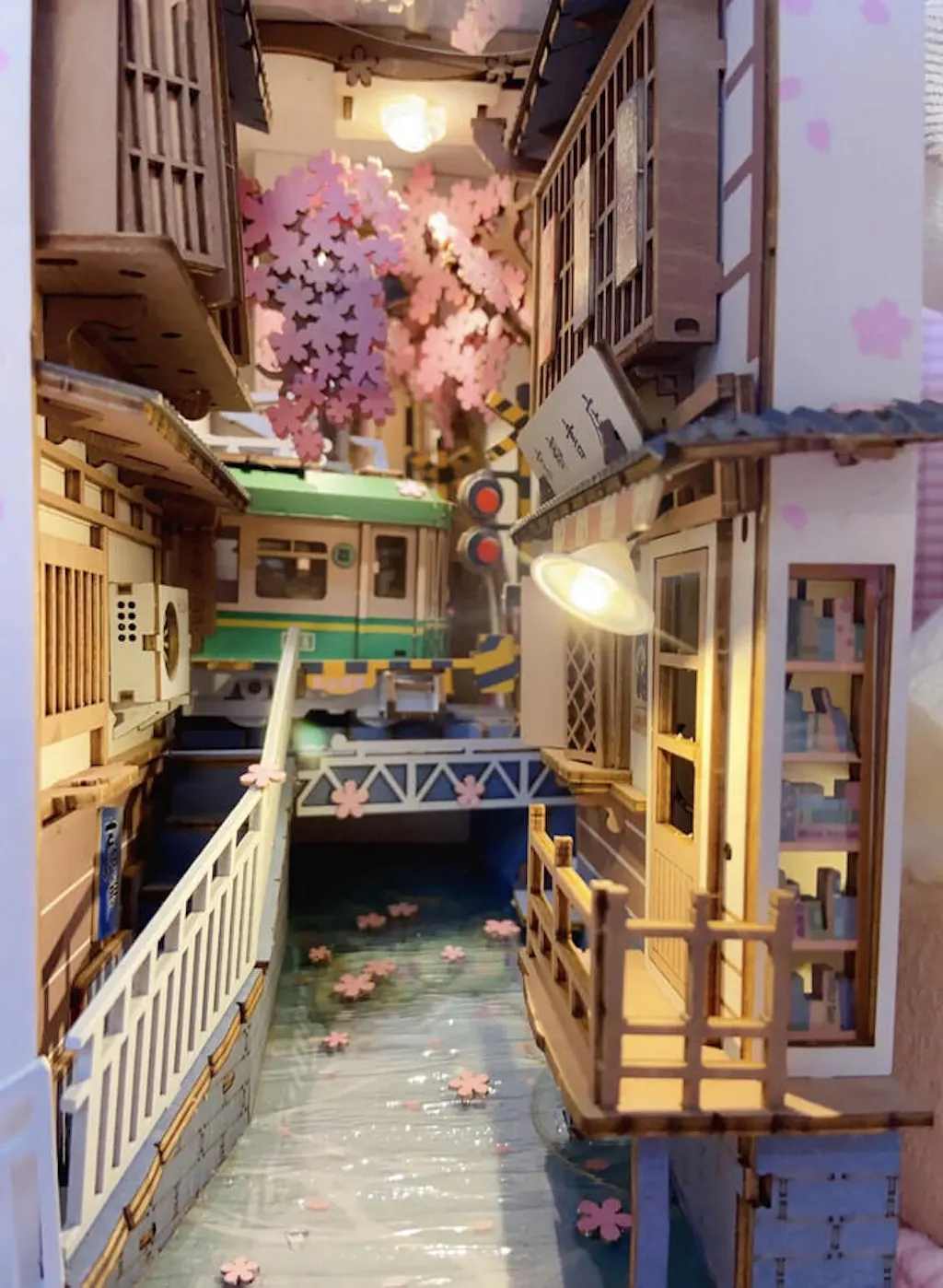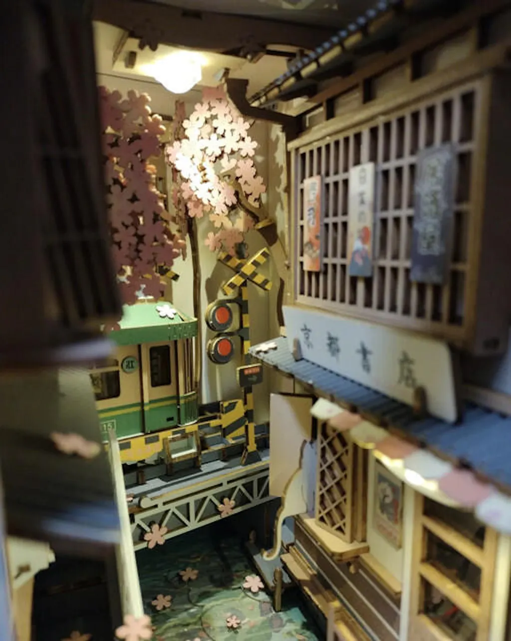 Sali a bordo di un treno giapponese e goditi le strade di Tokyo in primavera con questo magnifico kit di book nook. Una decorazione perfetta per la tua libreria o qualsiasi altro spazio della tua casa. Sarà ancora più impressionante al buio con le luci calde accese.