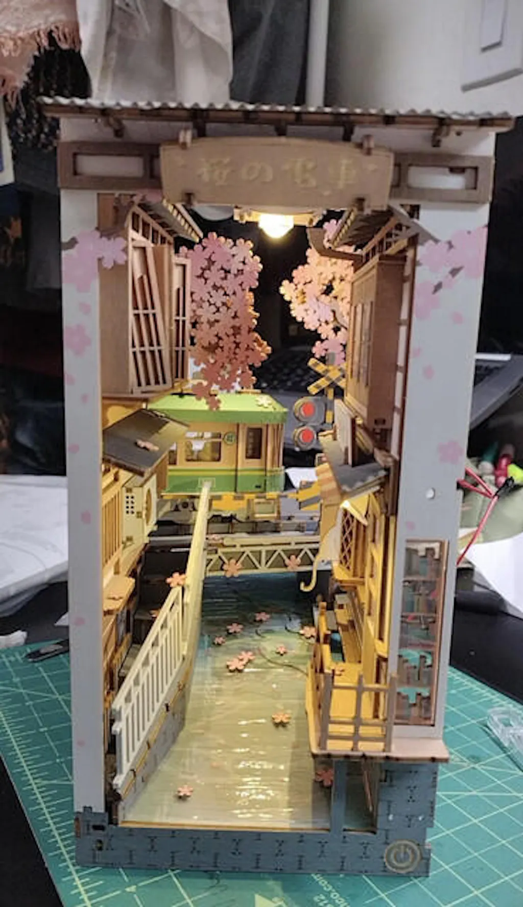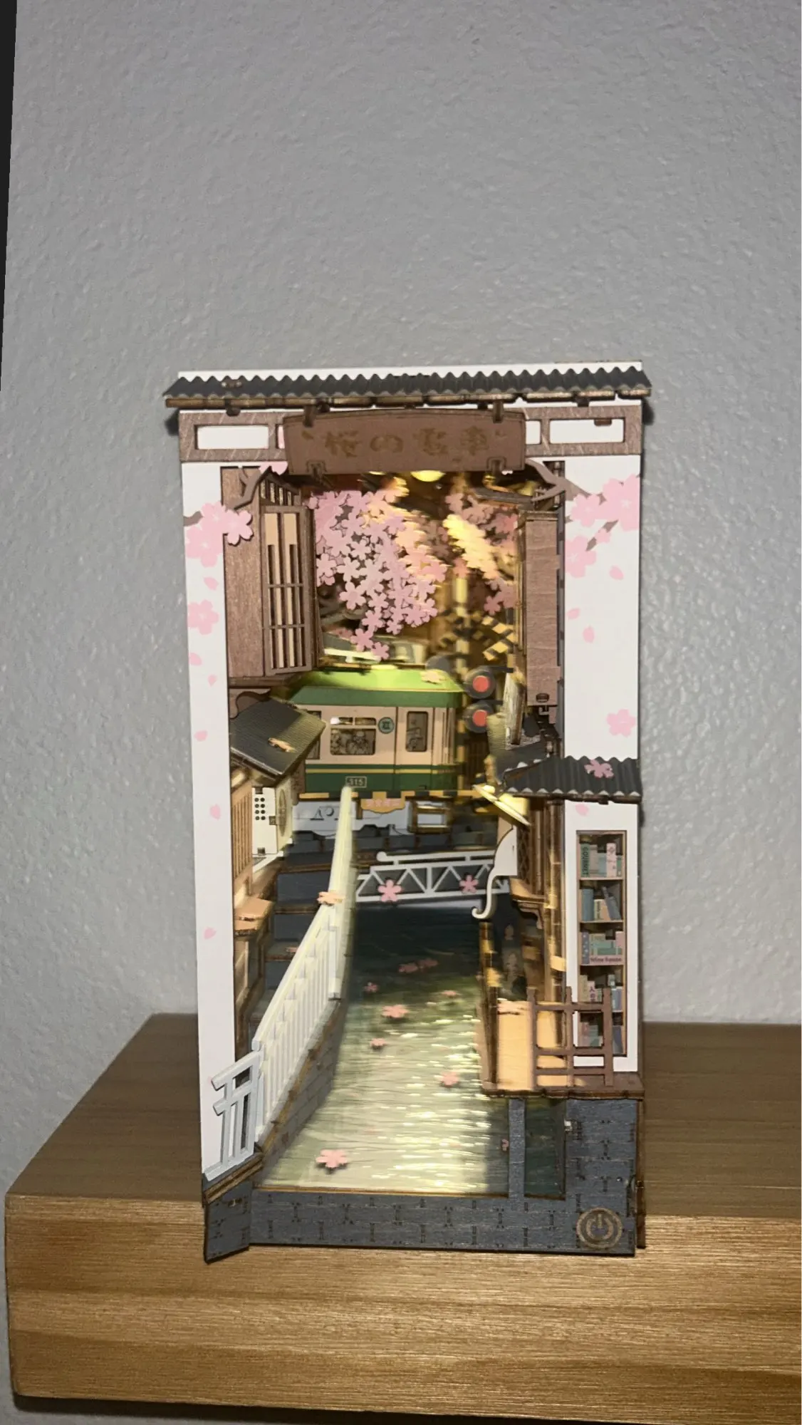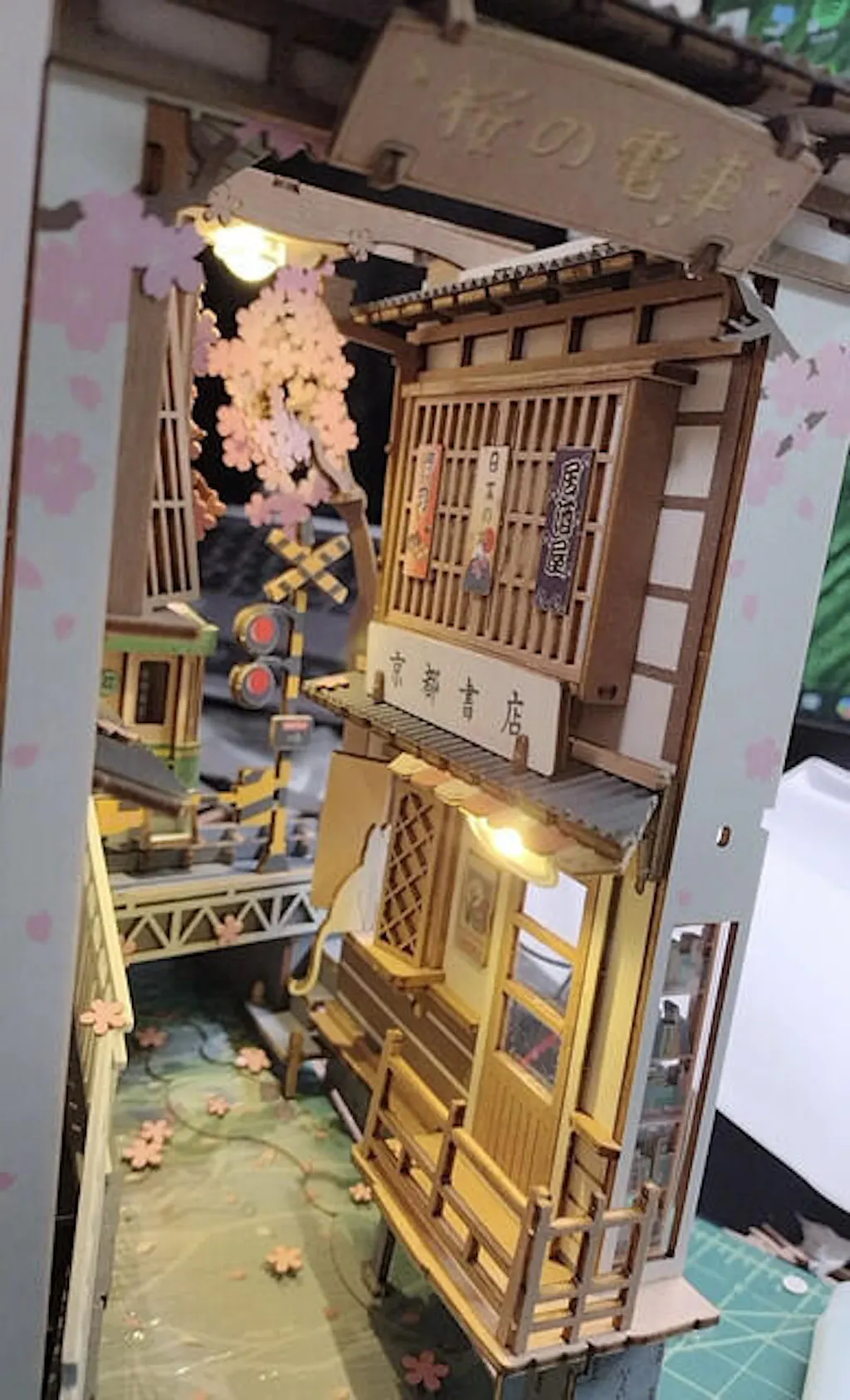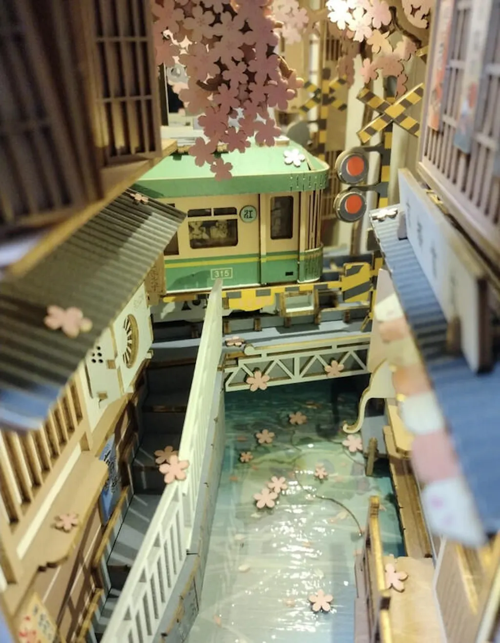 Sali a bordo di un treno giapponese e goditi le strade di Tokyo in primavera con questo magnifico kit di book nook. Una decorazione perfetta per la tua libreria o qualsiasi altro spazio della tua casa. Sarà ancora più impressionante al buio con le luci calde accese.