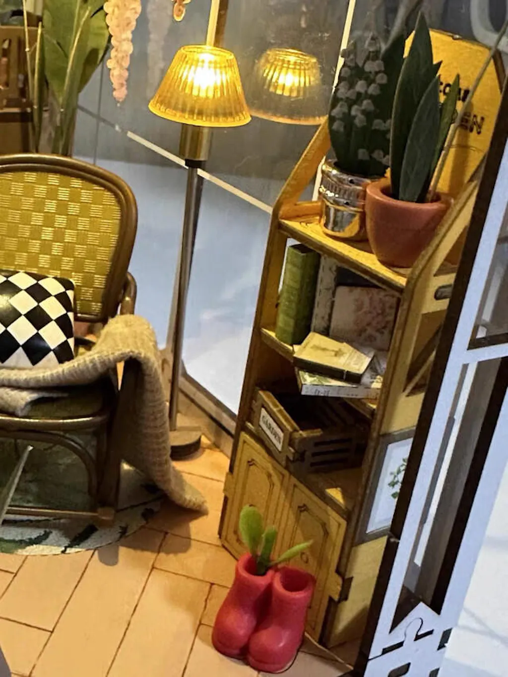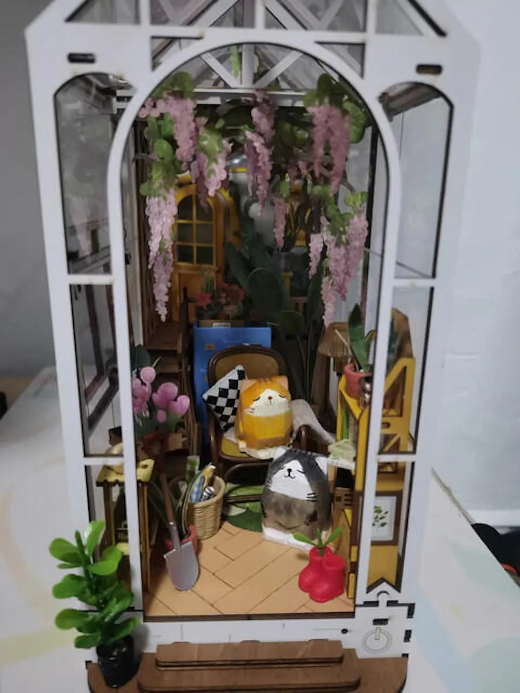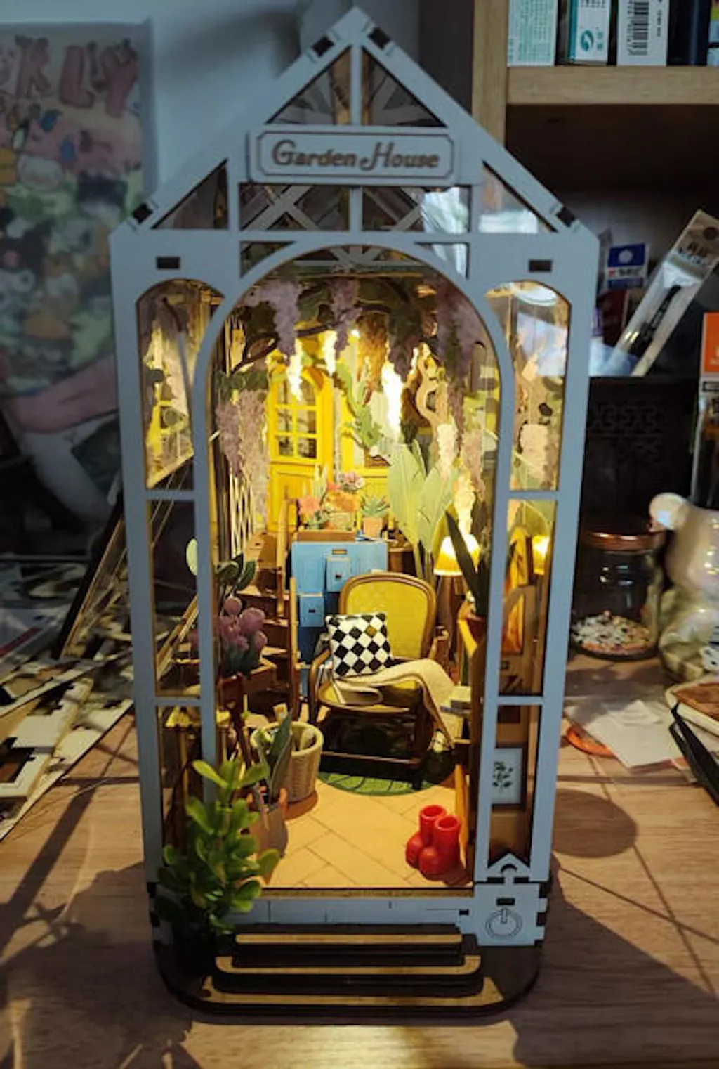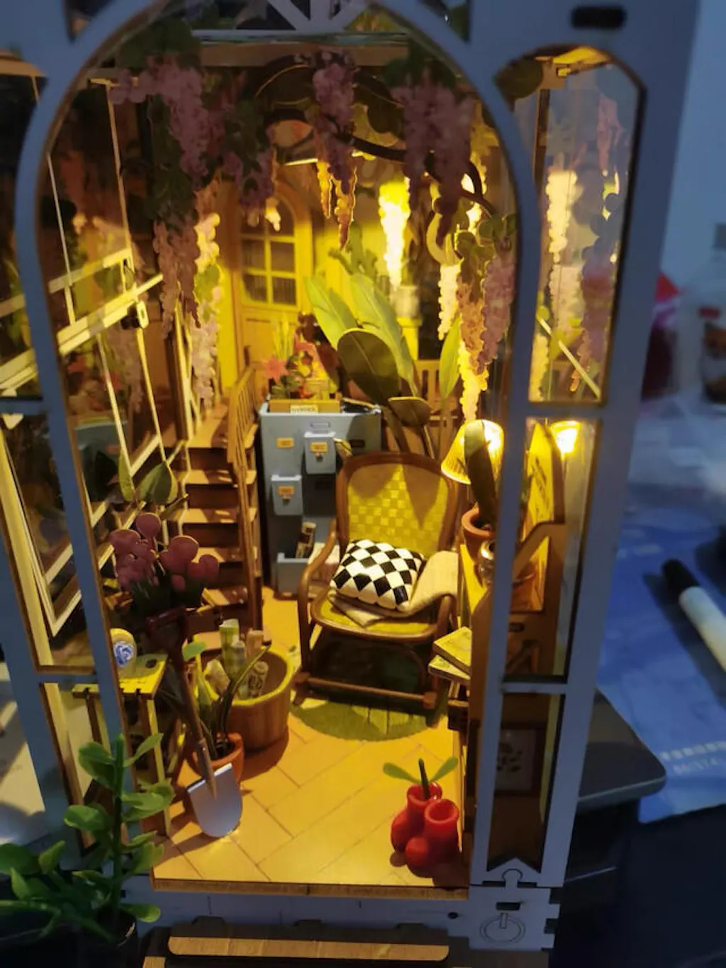 Una volta completato, inserisci con cura il tuo Book Nook tra i libri della tua scaffalatura. L'illuminazione integrata creerà una finestra luminosa e accattivante sul tuo mondo in miniatura.